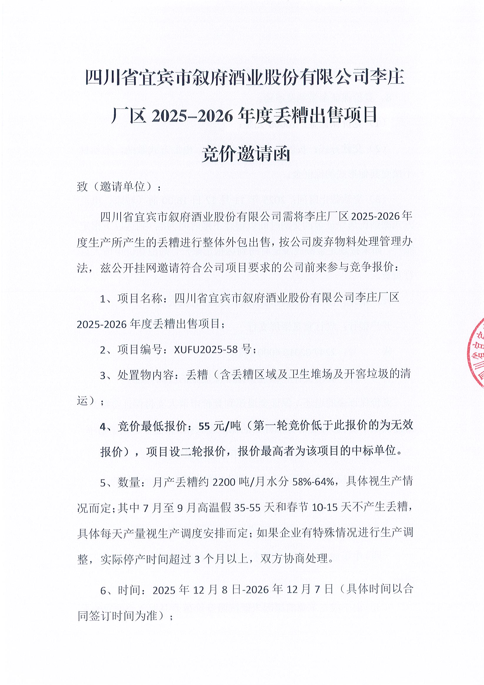 四川省宜宾市叙府酒业股份有限公司李庄厂区2025-2026年度丢糟出售项目竞价邀请函