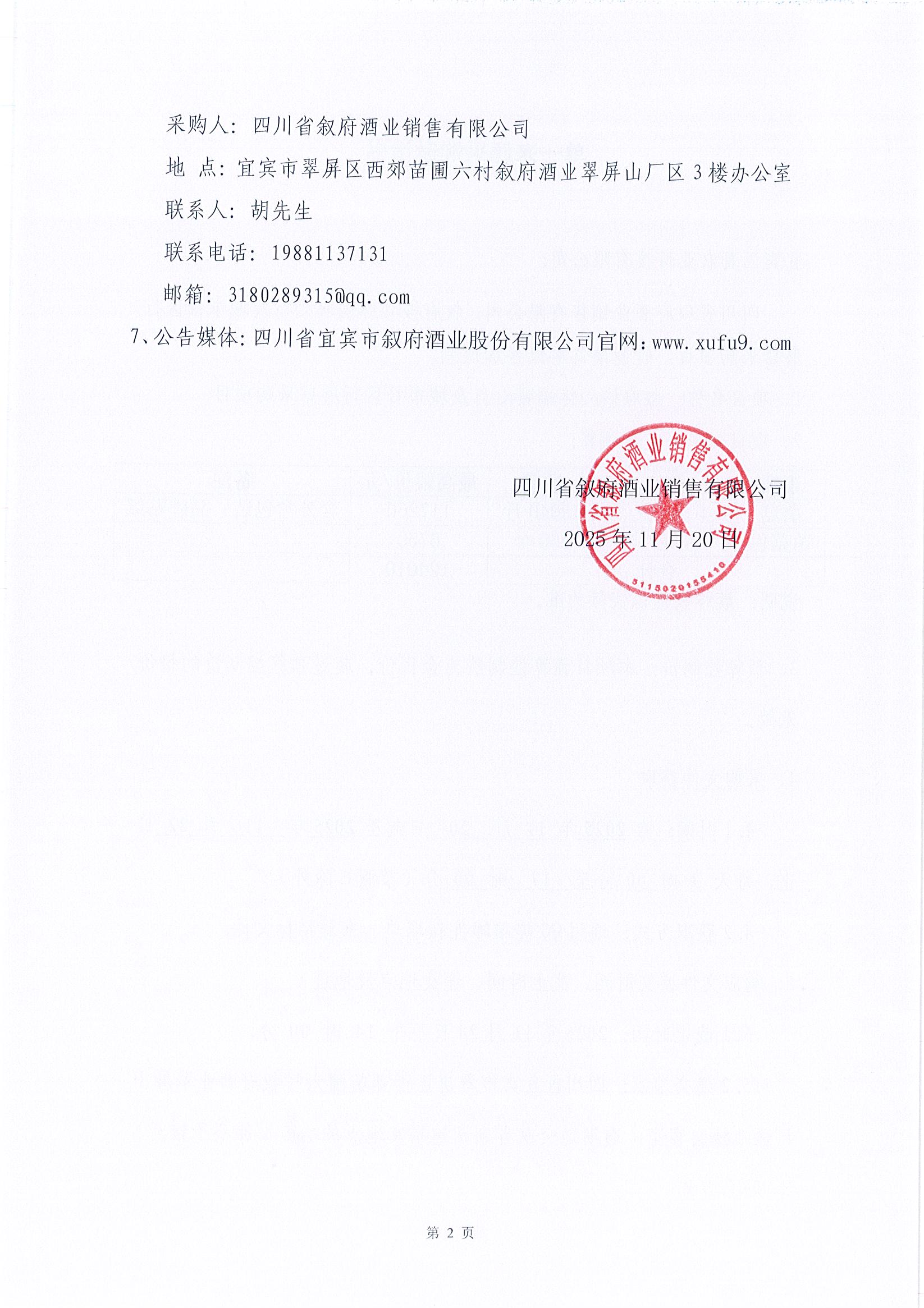 四川省宜宾市叙府酒业股份有限公司李庄厂区2025-2026年度丢糟出售项目竞价结果公示公告