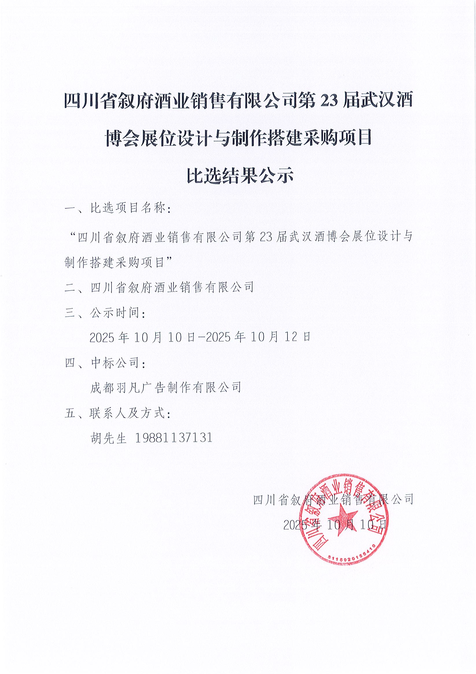 四川省叙府酒业销售有限公司叙府大曲(蓝标)产品TVC的创作与拍摄采购项目中标结果公示公告