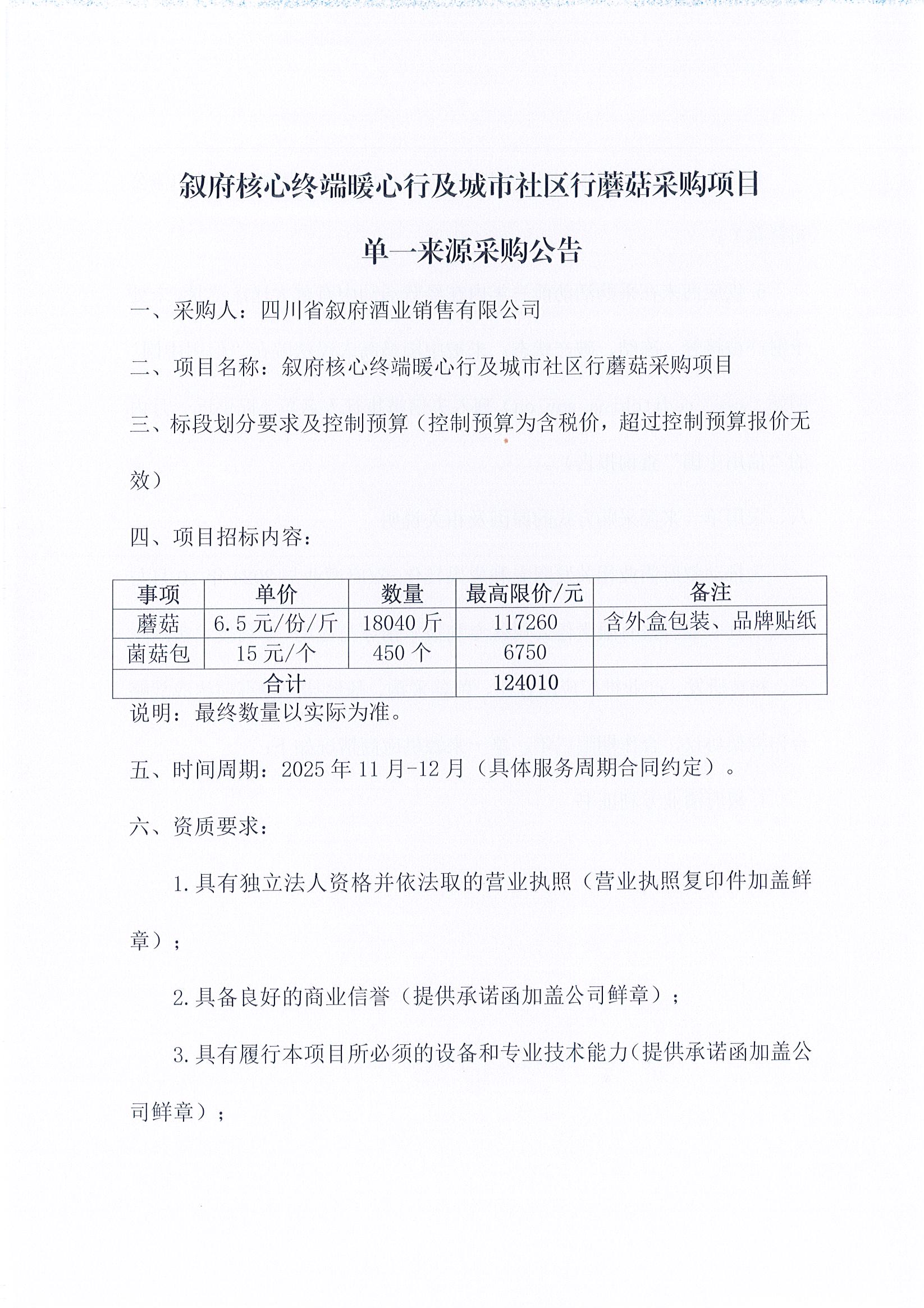 四川省叙府酒业销售有限公司叙府核心终端暖心行及城市社区行蘑菇采购项目