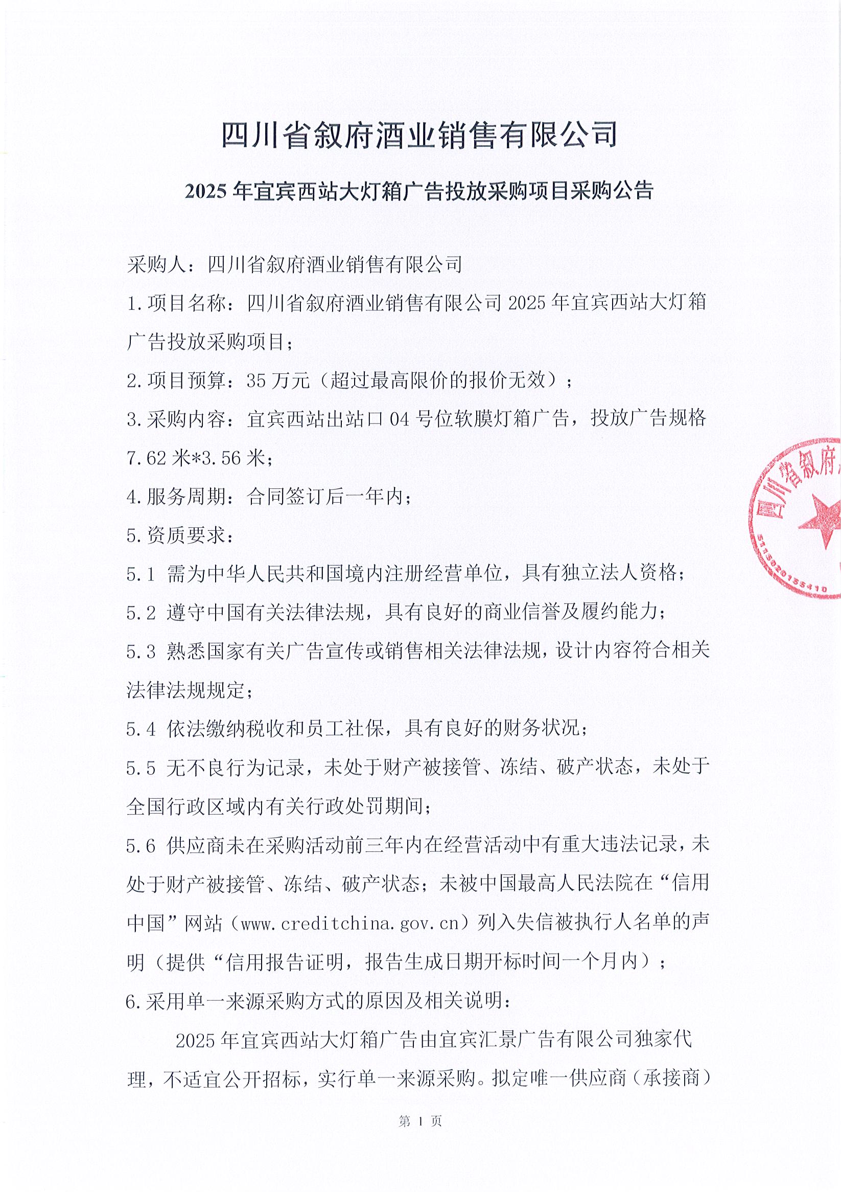 四川省叙府酒业销售有限公司2025年宜宾西站大灯箱广告投放采购项目单一来源采购结果公示公告