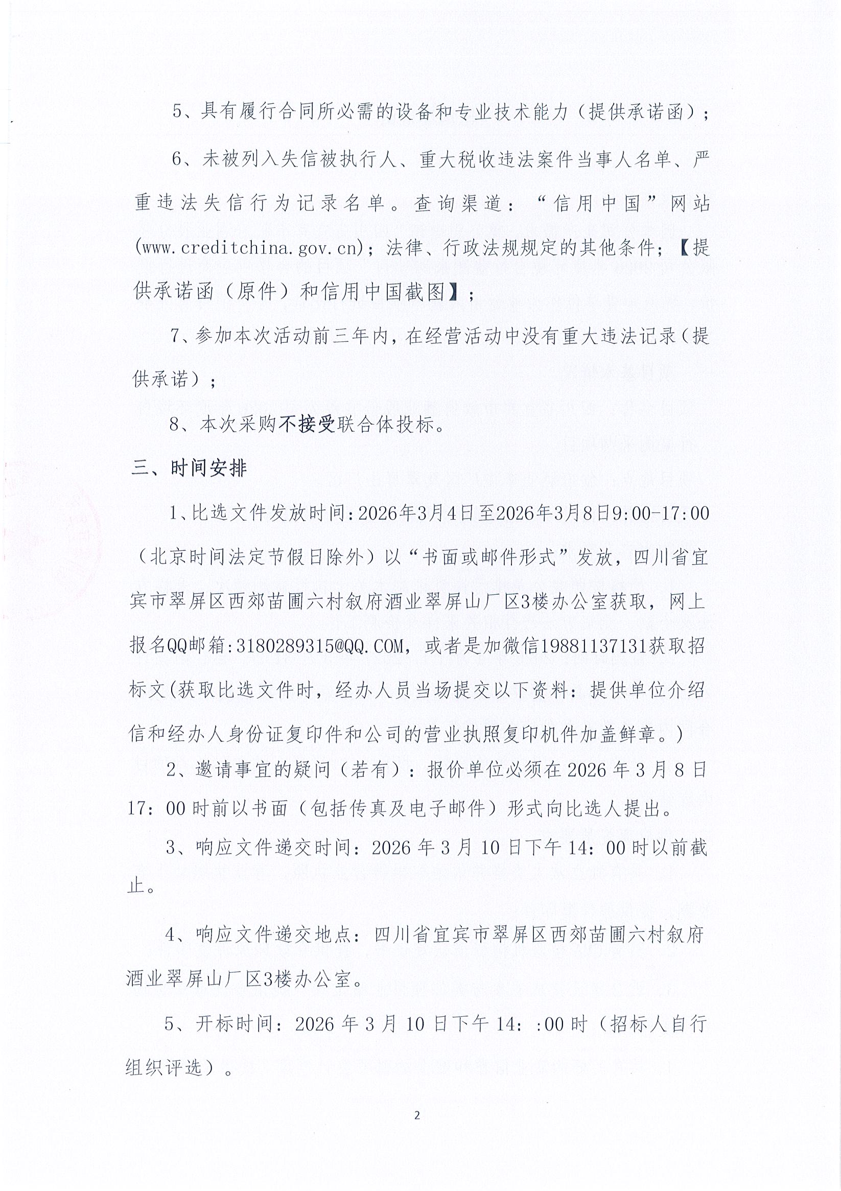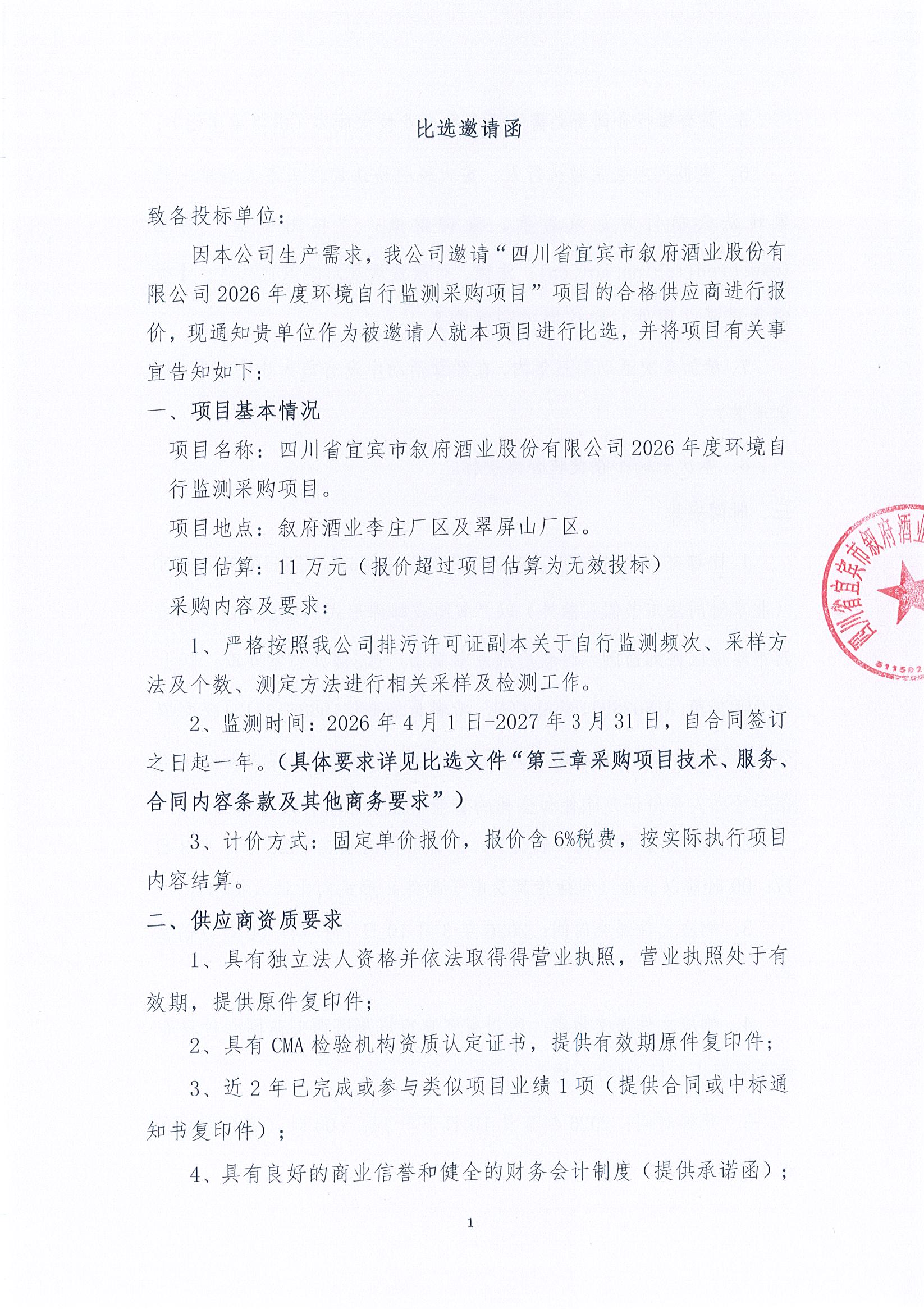 四川省宜宾市叙府酒业股份有限公司2026年度环境自行监测采购项目比选招标公示公告