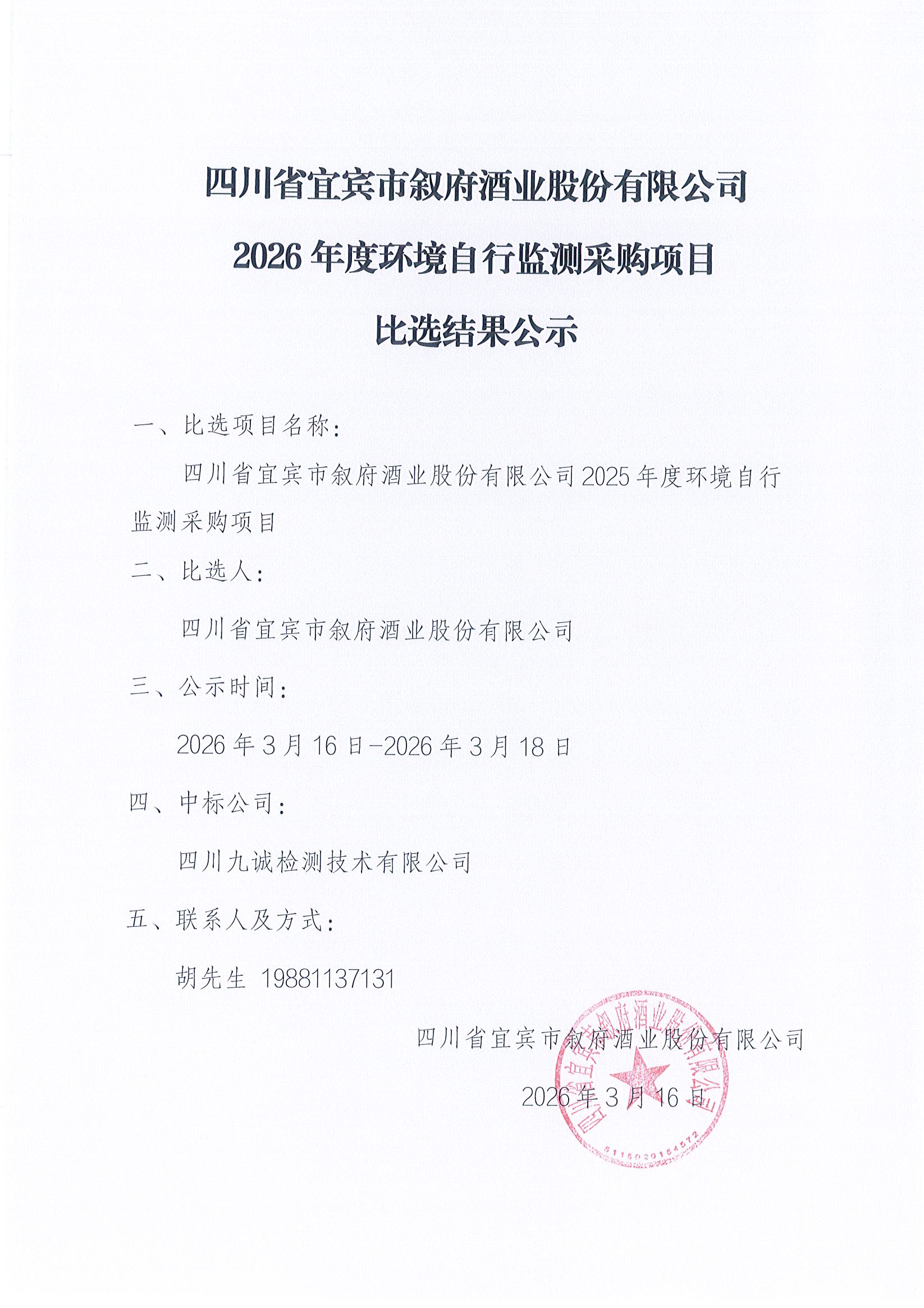 四川省宜宾市叙府酒业股份有限公司2026年度环境自行监测采购项目比选结果公示公告